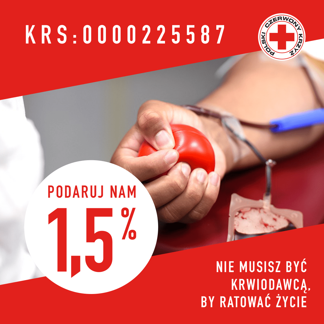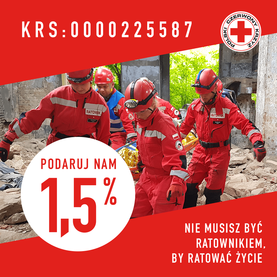 Każdego roku Polski Czerwony Krzyż niesie pomoc ponad 1 000 000 potrzebujących. Nie byłoby to możliwe bez wsparcia darczyńców. Twój 1,5 % ma znaczenie.